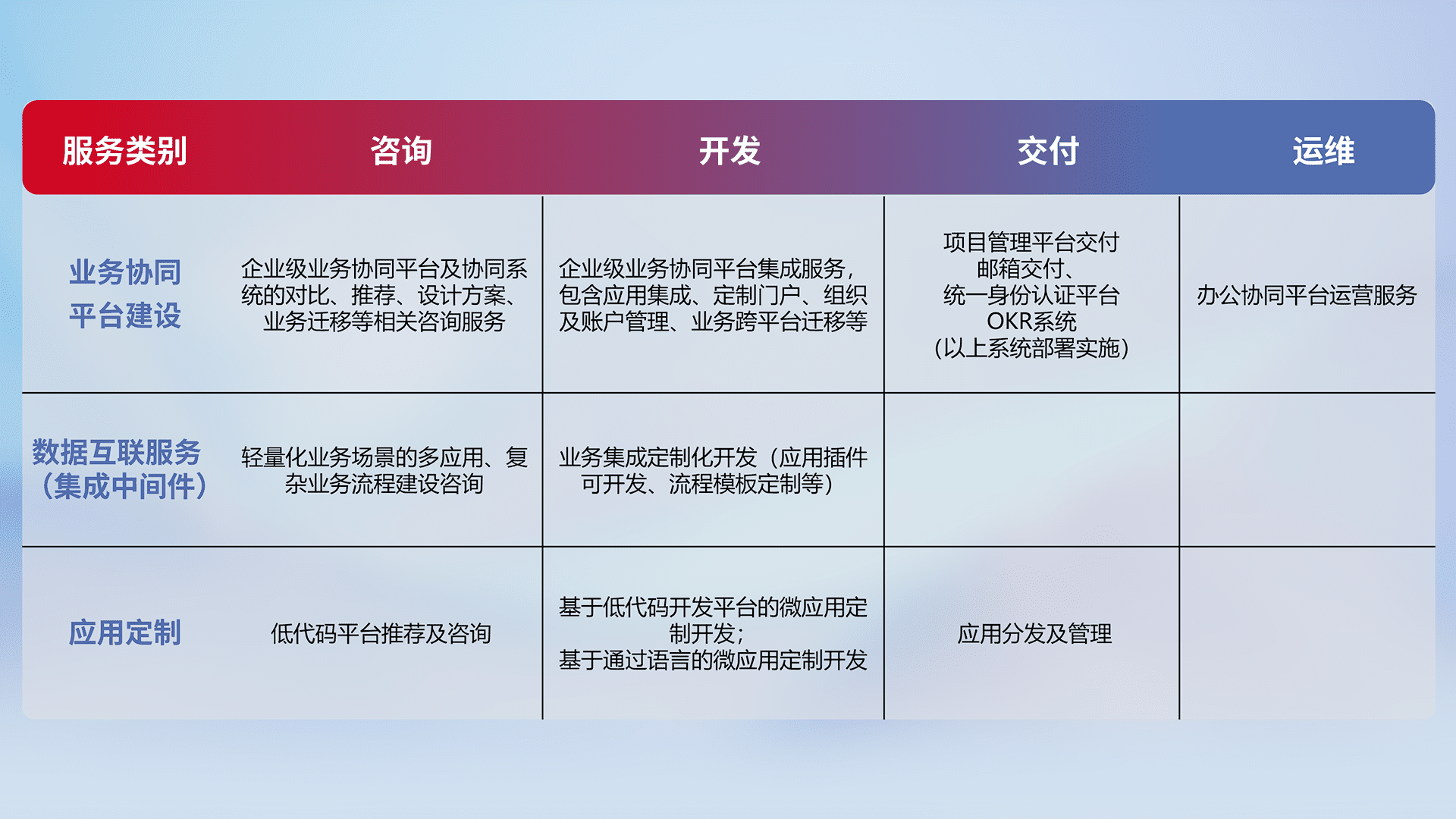 针对钉钉、、企微、、、、IDaas等平台级产品提供产品的规划、、方案、、、交付、、、定制化开发等服务,,实现如统一协同办公、、、智能客户服务、、、混合会议管理、、智能数据查询、、、等业务场景,,,实现数字化转型。。。。