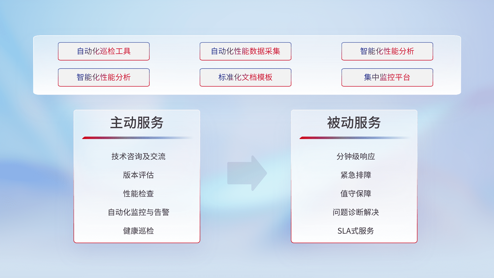 智能化工具和标准化文档,,,保障服务质量,,,,提供主动服务(包含技术咨询、、、版本评估、、性能检查、、、、自动化监控与告警、、、健康巡检)和被动服务包含(分钟级响应、、、紧急排障、、、、值守保障、、、问题诊断解决、、、SLA服务)。。