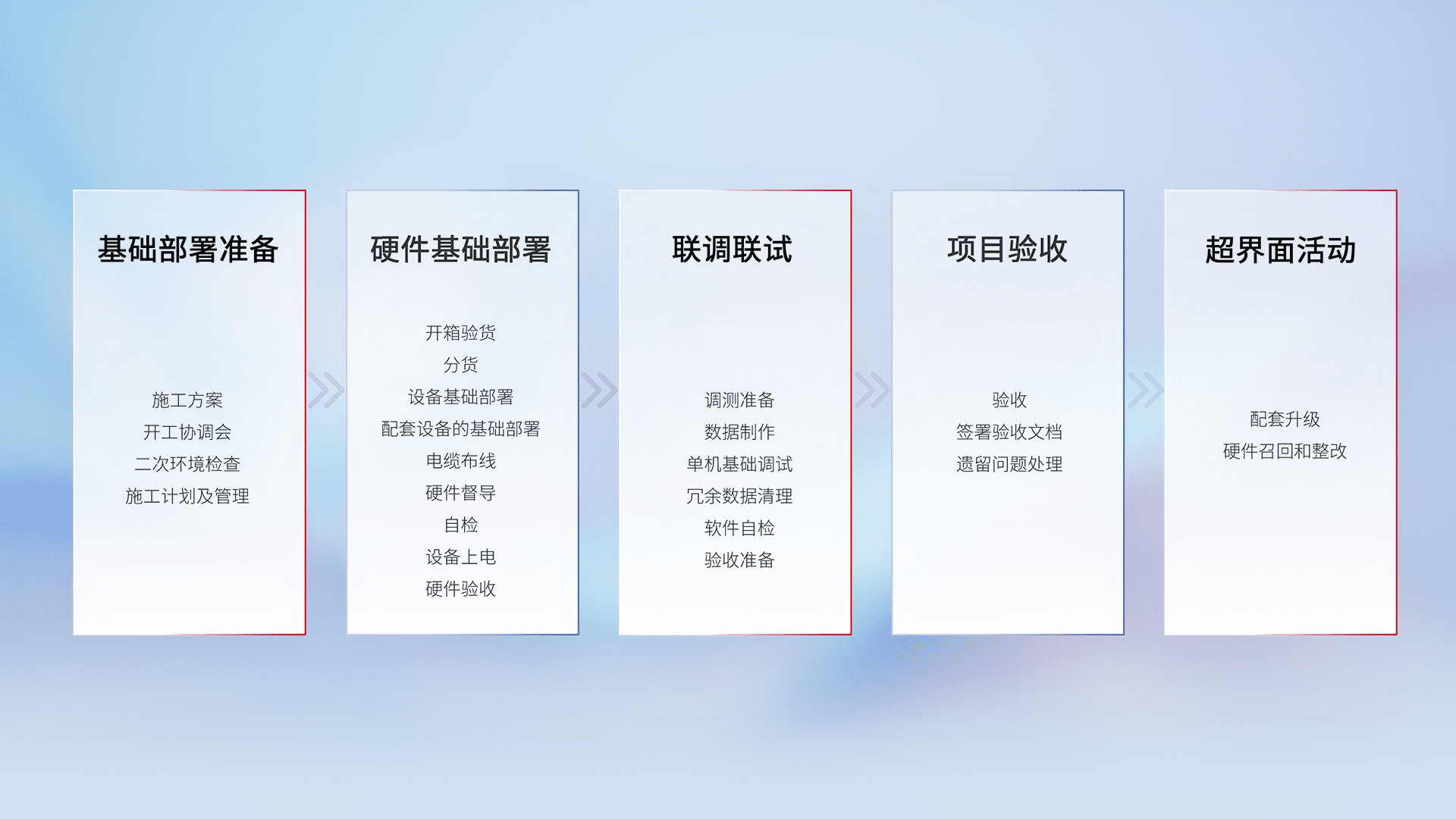 从基础部署准备、、、硬件基础部署、、联调联试、、项目验收、、越界面活动的全过程可追溯,,,,保证施工质量和进度。。